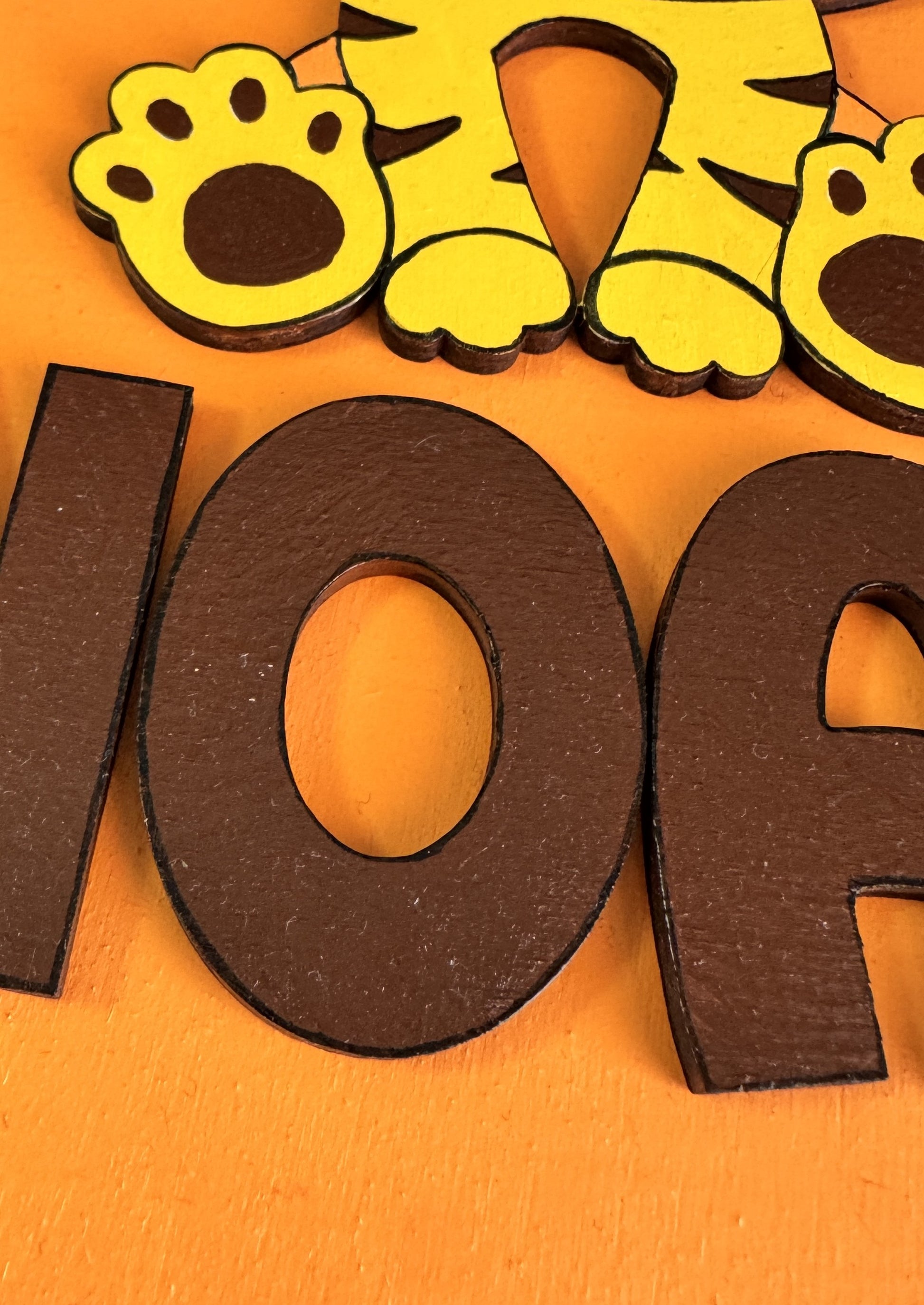 Il protagonista è un tenero tigrotto 3D, intagliato nel legno e dipinto interamente a mano con colori delicati e dettagli curati.