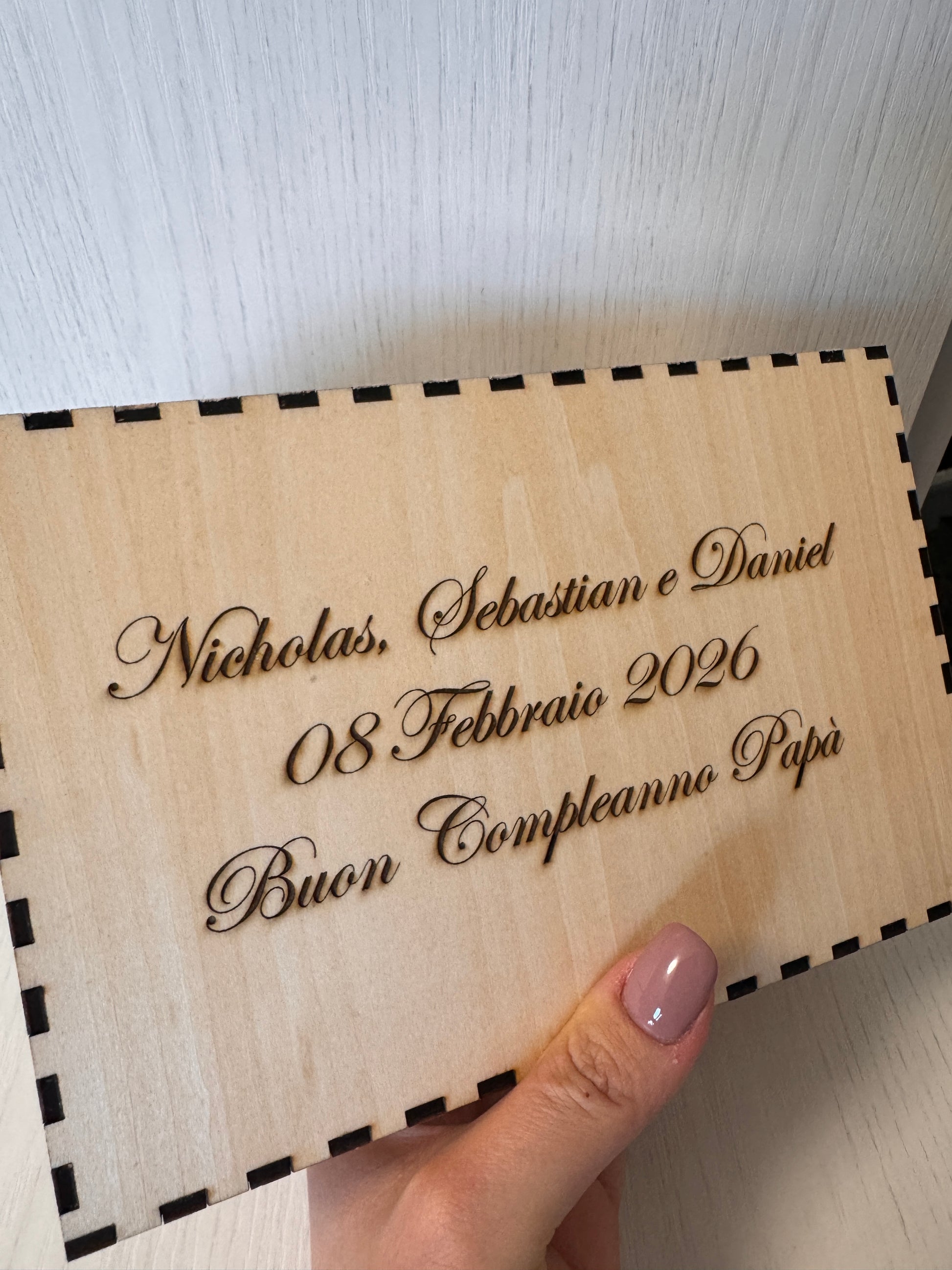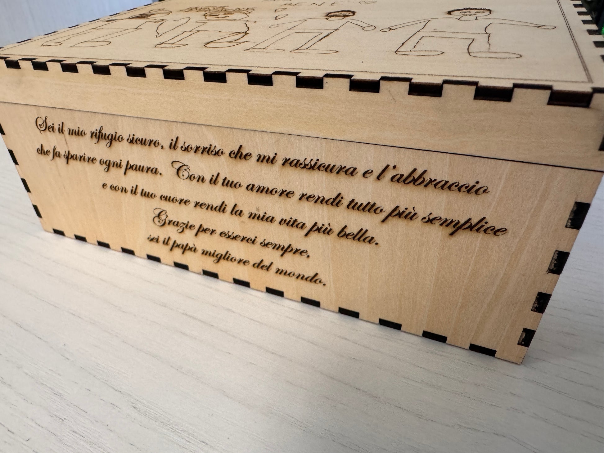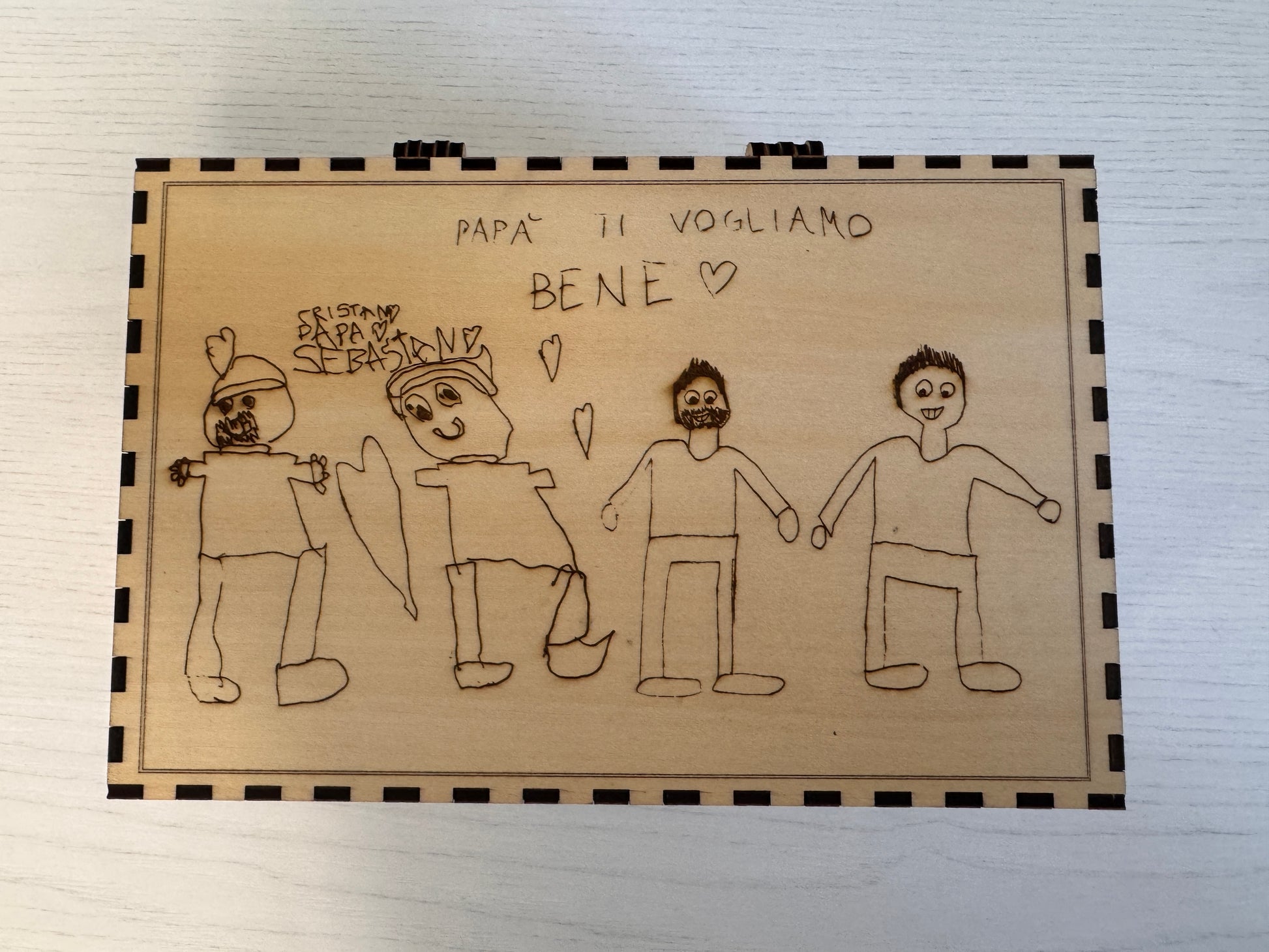 Ogni scatola è unica, proprio come il legame tra padre e figlio. Il disegno viene inciso con cura per mantenere ogni dettaglio originale, trasformando un semplice foglio in un’emozione che dura per sempre.