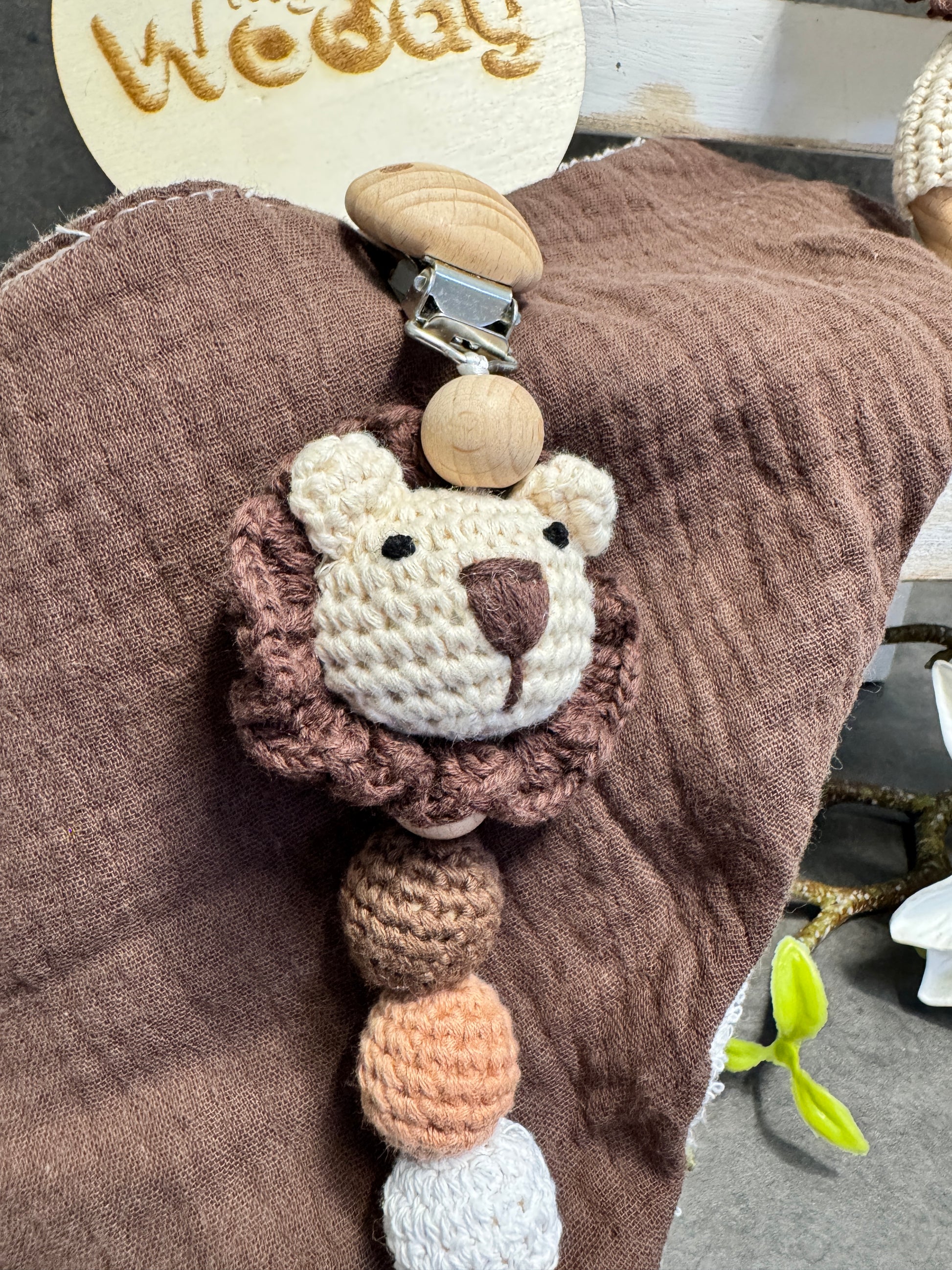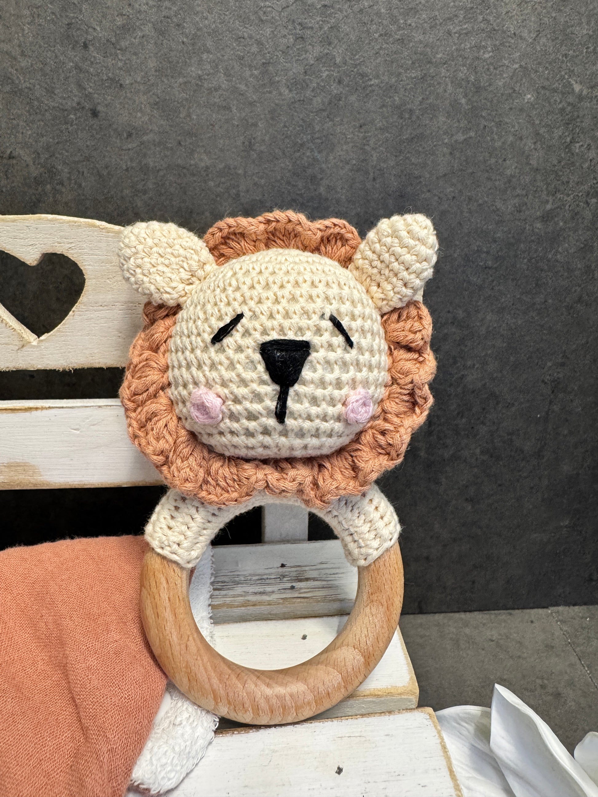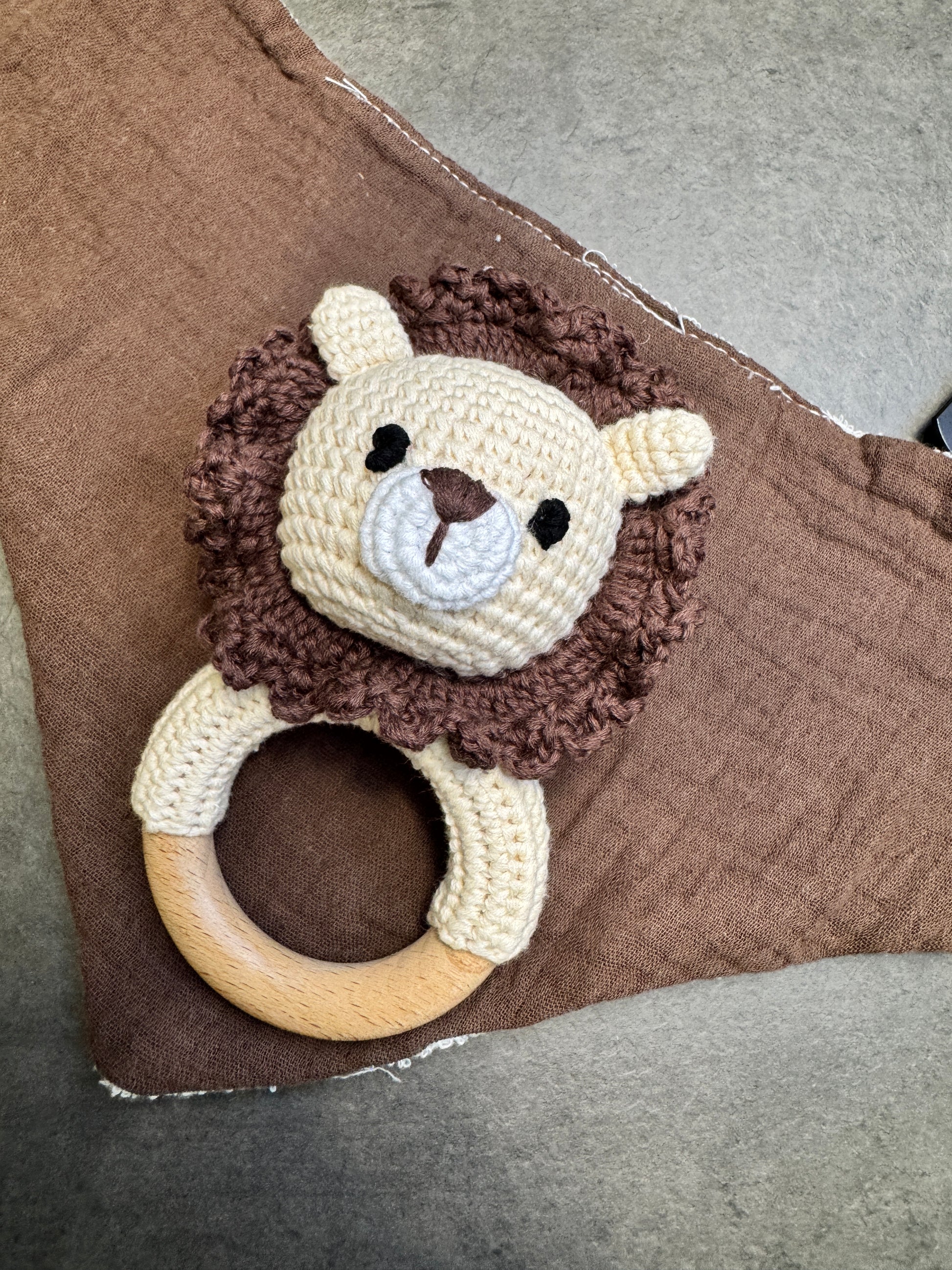 🧸 Sonaglio in legno naturale con tenero animaletto realizzato a uncinetto, pensato per stimolare i sensi del bambino in modo sicuro e delicato.