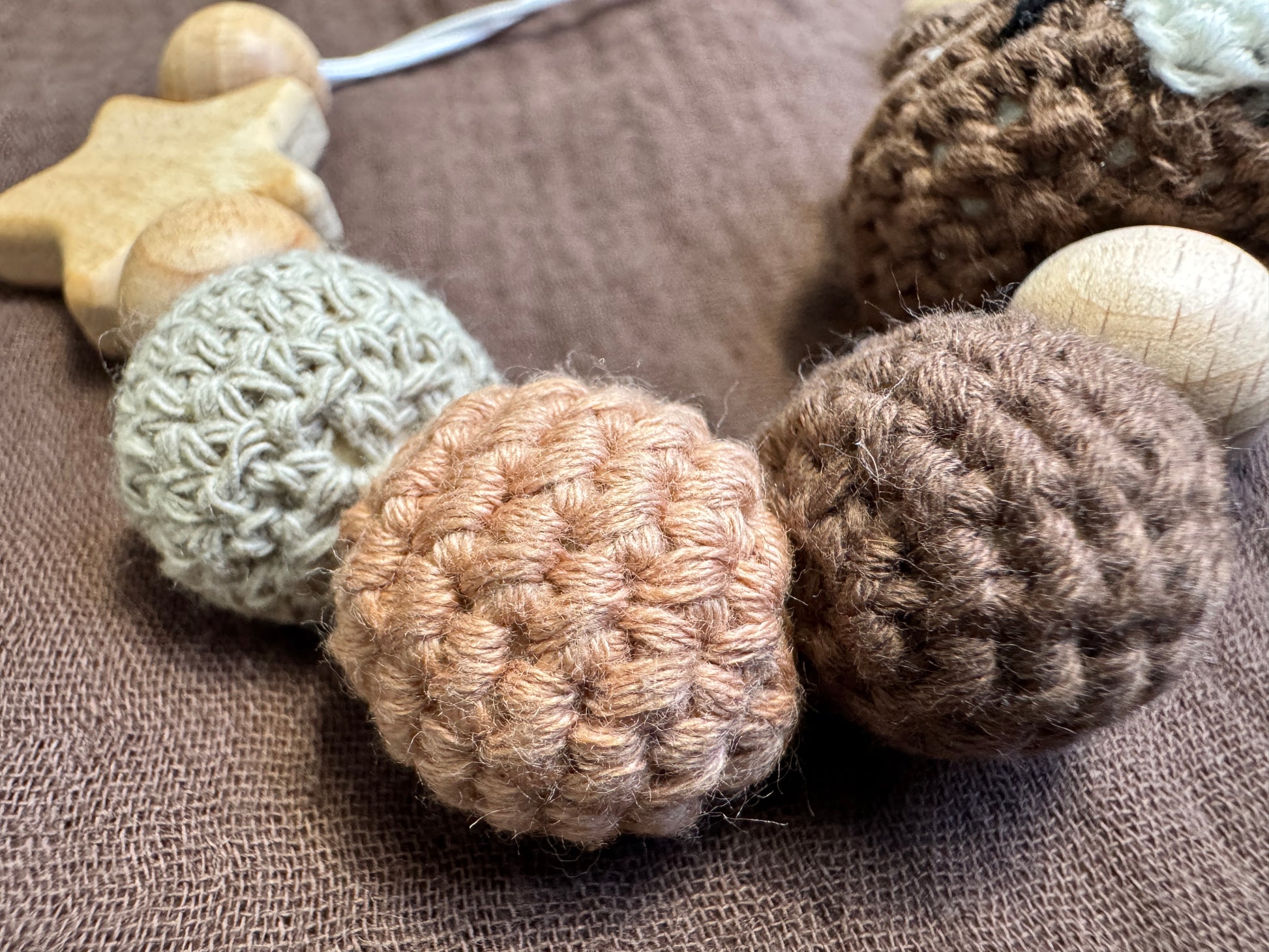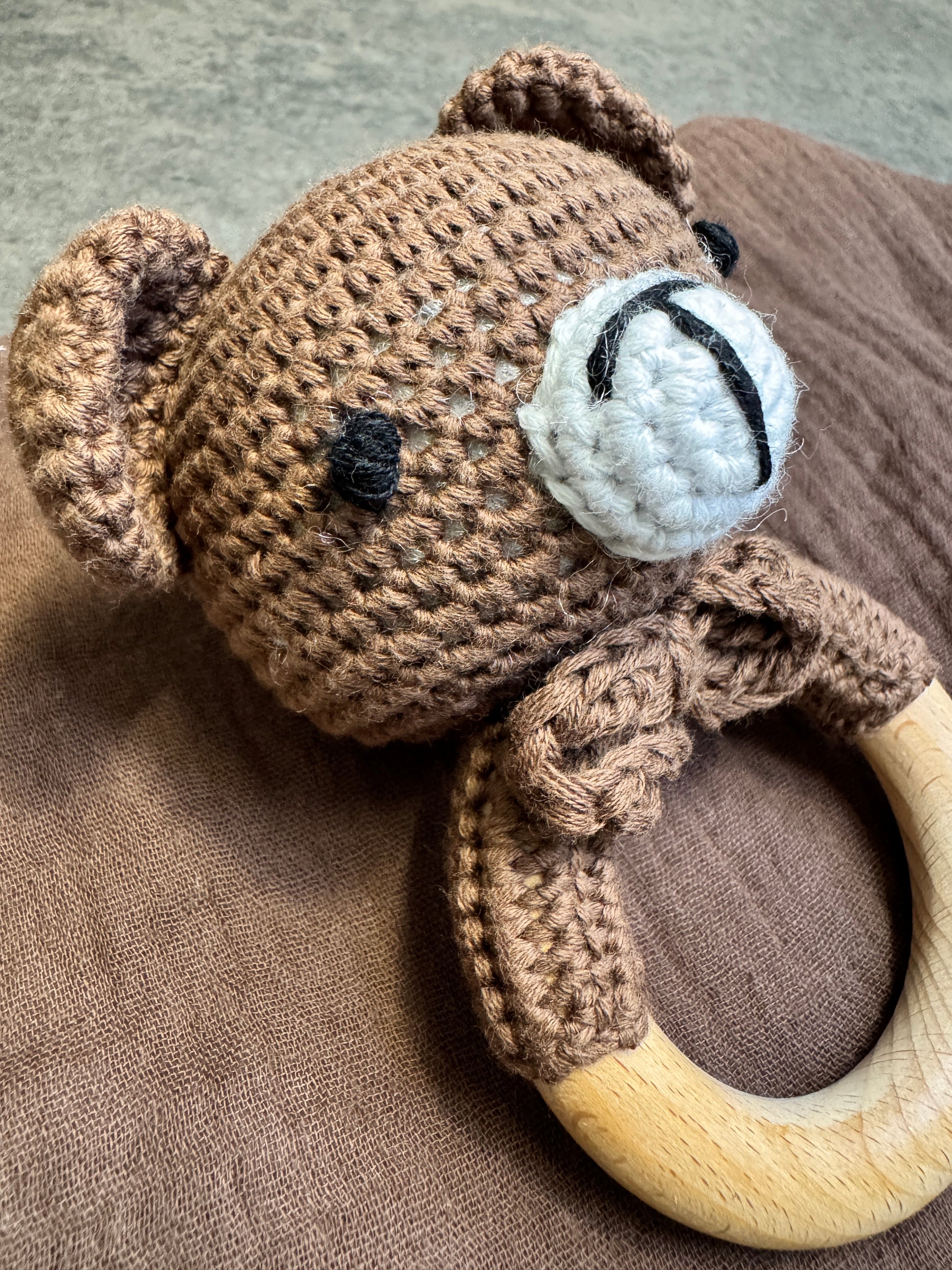 🧸 Sonaglio in legno naturale con tenero animaletto realizzato a uncinetto, pensato per stimolare i sensi del bambino in modo sicuro e delicato.