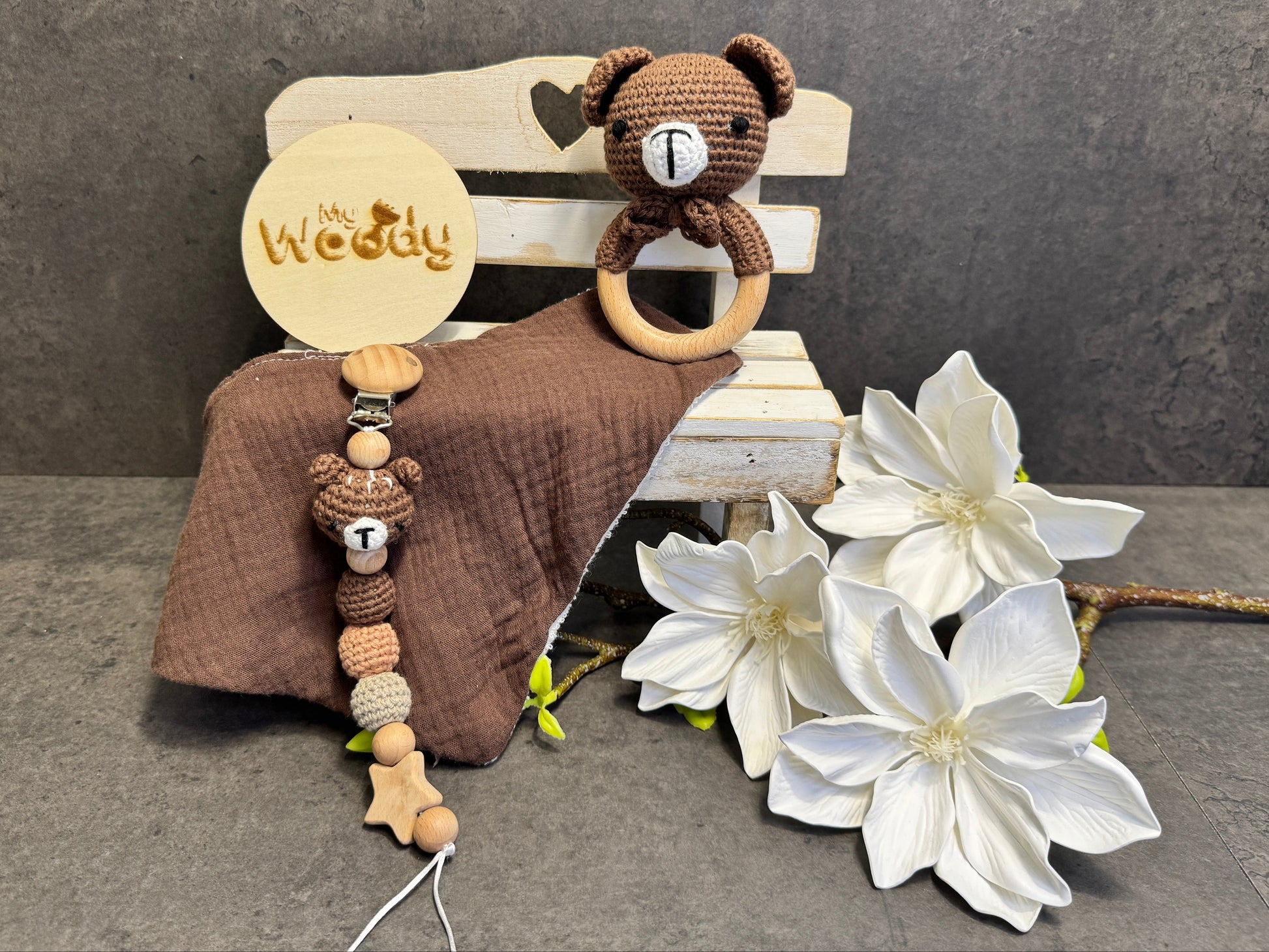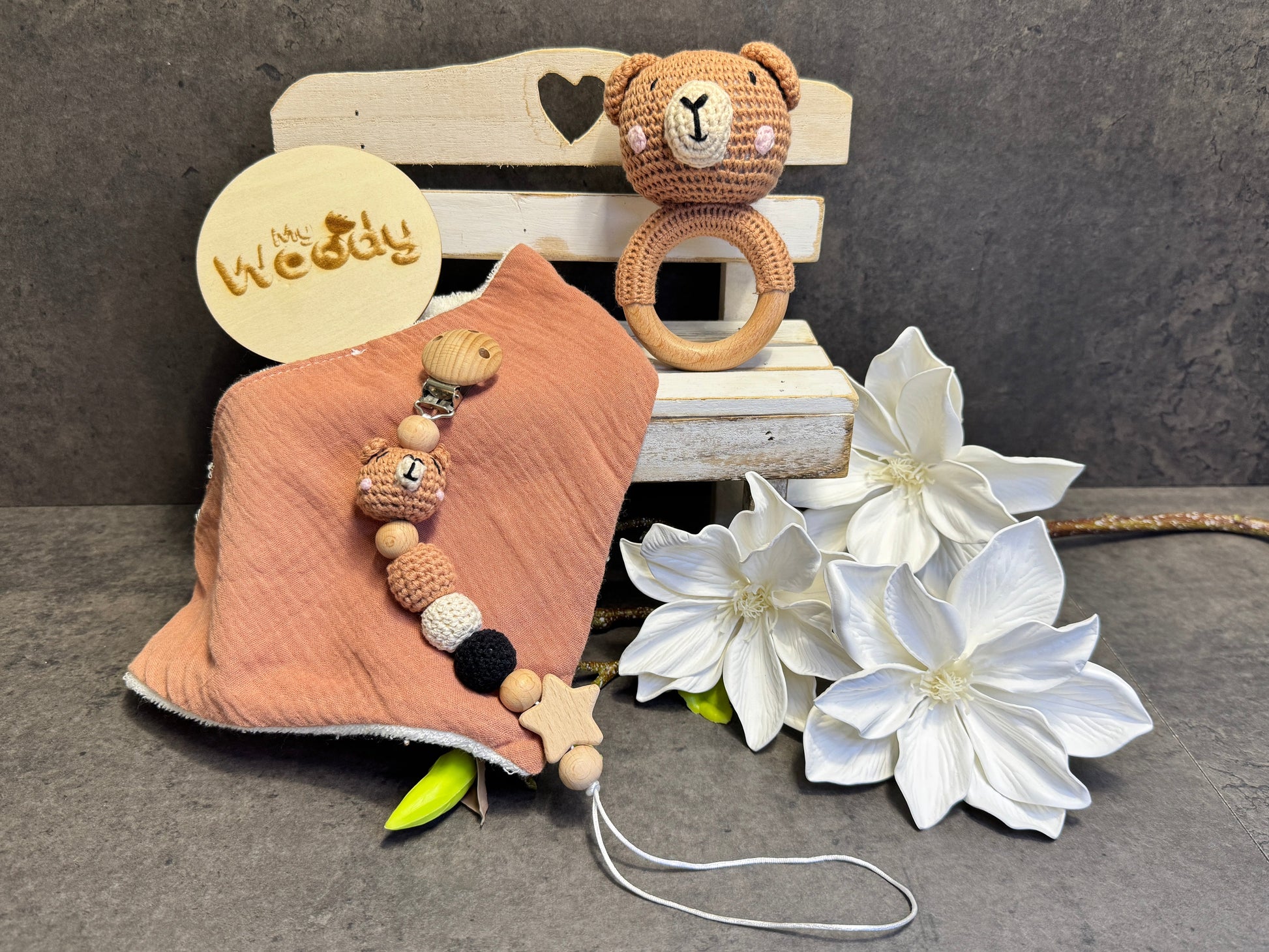 Il Set "Piccole Coccole Orsetto" è un set nascita artigianale con bavaglino, sonaglio e catenella portaciuccio personalizzata.