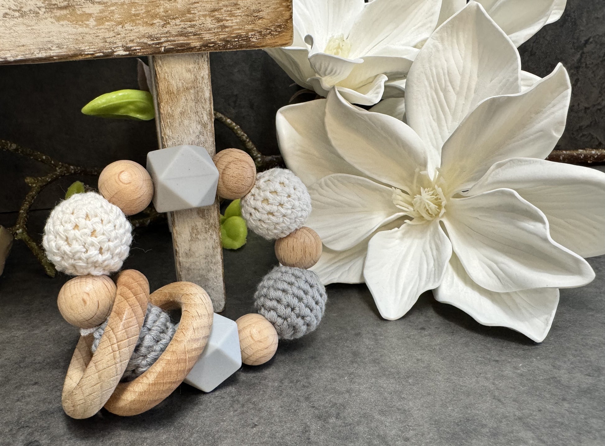 - un sonaglio in legno con dolce animaletto ricamato a uncinetto, realizzato a mano per accompagnare i primi giochi;