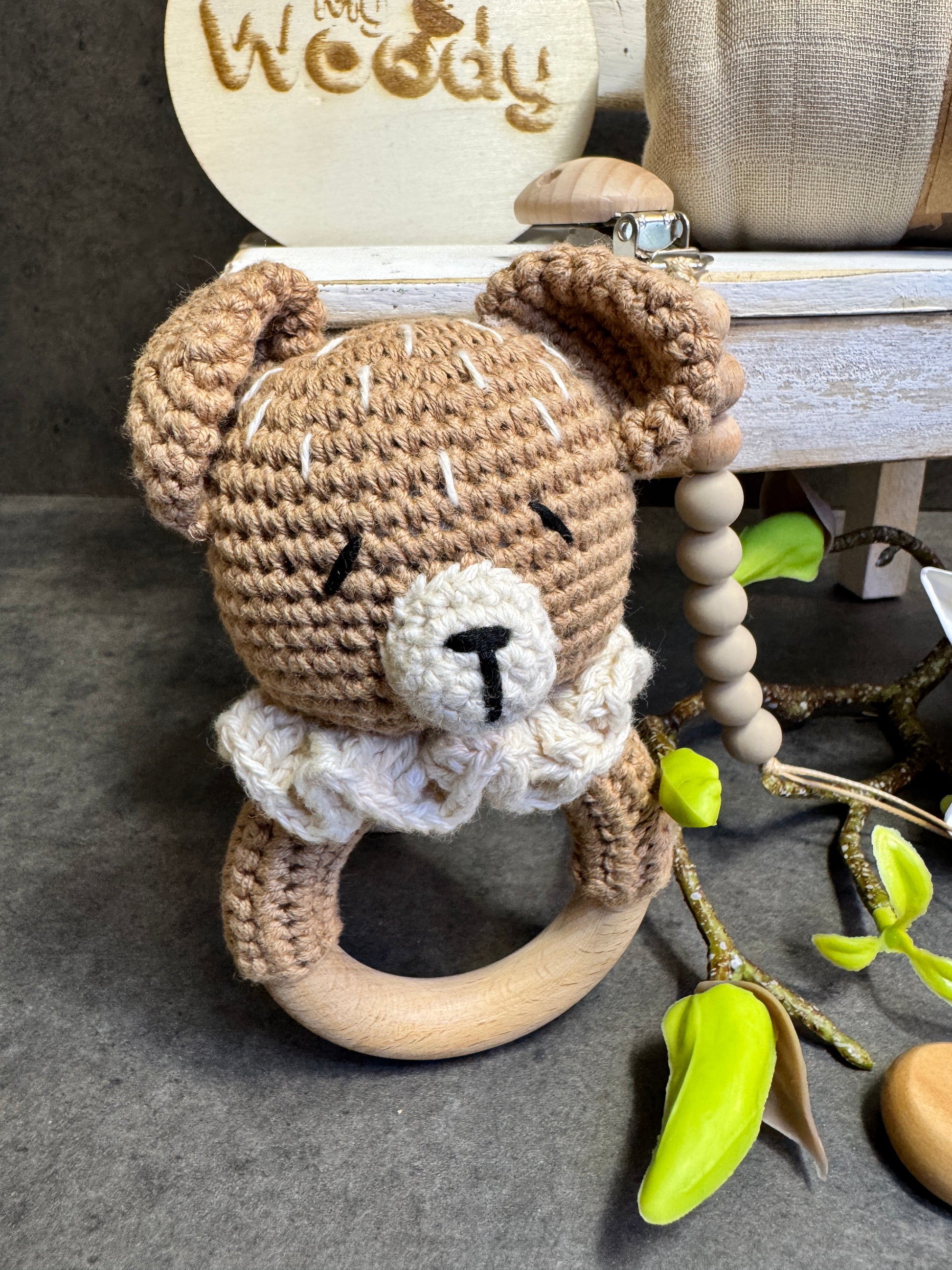 🐻 Sonaglio in legno con animaletto ricamato a uncinetto – stimola i sensi del bambino con un suono delicato e una texture piacevole al tatto.
