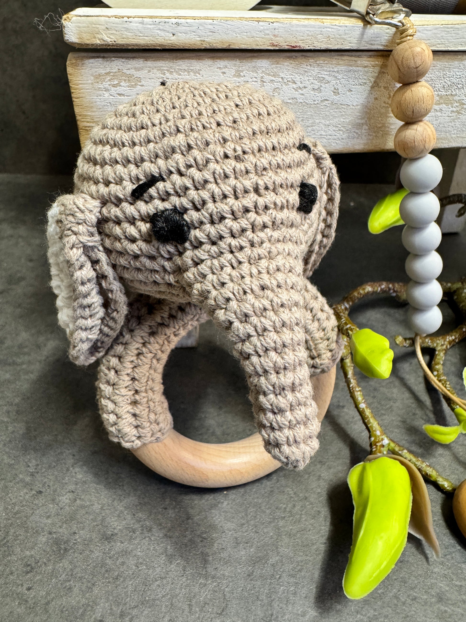 🐻 Sonaglio in legno con animaletto ricamato a uncinetto – stimola i sensi del bambino con un suono delicato e una texture piacevole al tatto.