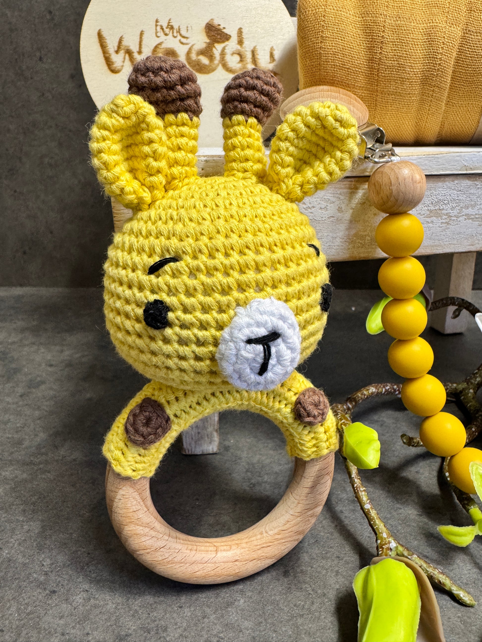 🐻 Sonaglio in legno con animaletto ricamato a uncinetto – stimola i sensi del bambino con un suono delicato e una texture piacevole al tatto.