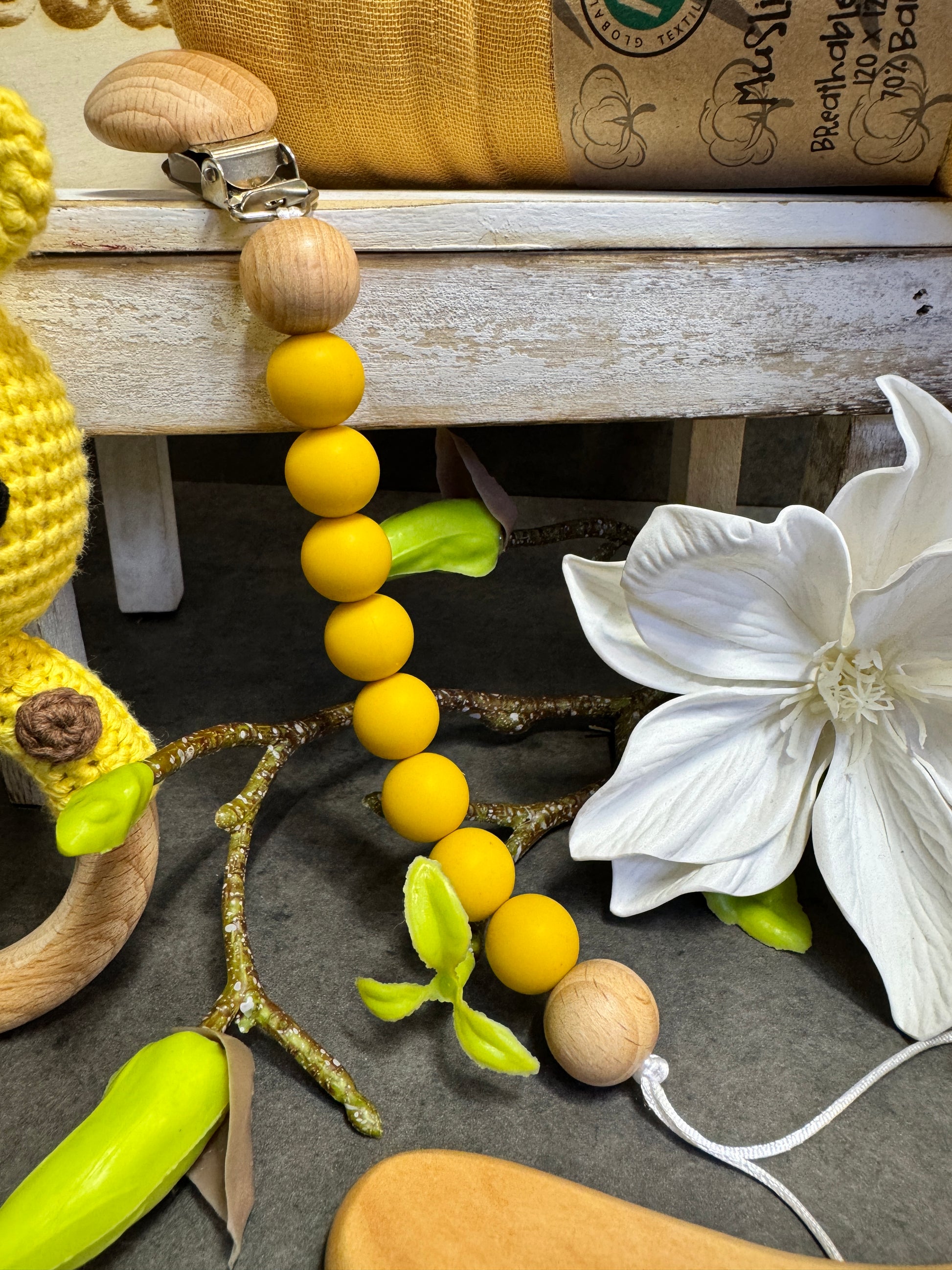 🌸 Catenella portaciuccio coordinata – pratica e graziosa, per tenere sempre a portata di mano il ciuccio o il giochino preferito.